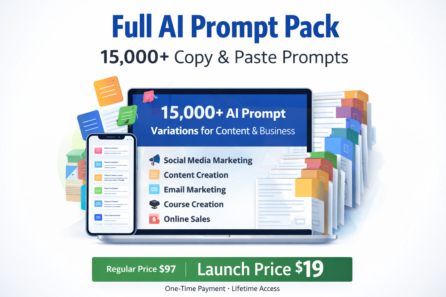 The Full Prompt Pack is a multi-category collection of powerful AI prompts designed to help you create content, build digital products, and grow an online business faster.